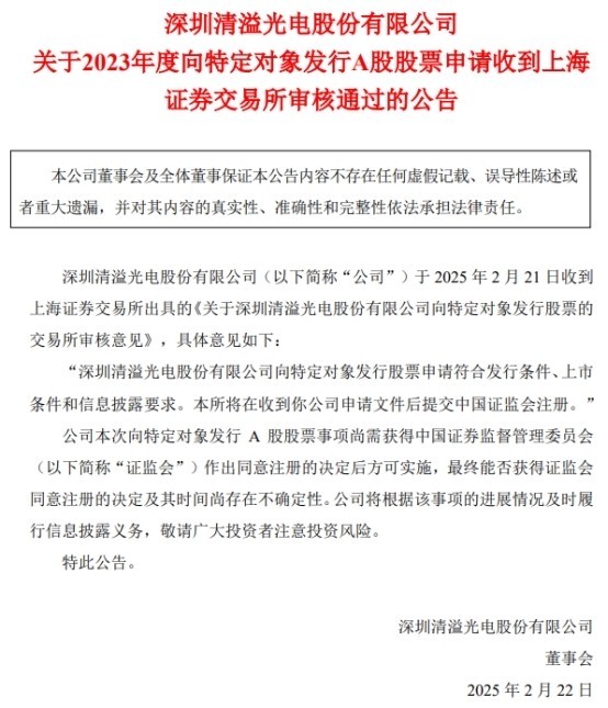 公司于2025年2月21日收到上海证券交易所出具的《关于深圳清溢光电股份有限公司向特定对象发行股票的交易所审核意见》,公司向特定对象发行股票申请符合发行条件、上市条件和信息披露要求。上交所将在收到公司申请文件后提交中国证监会注册。